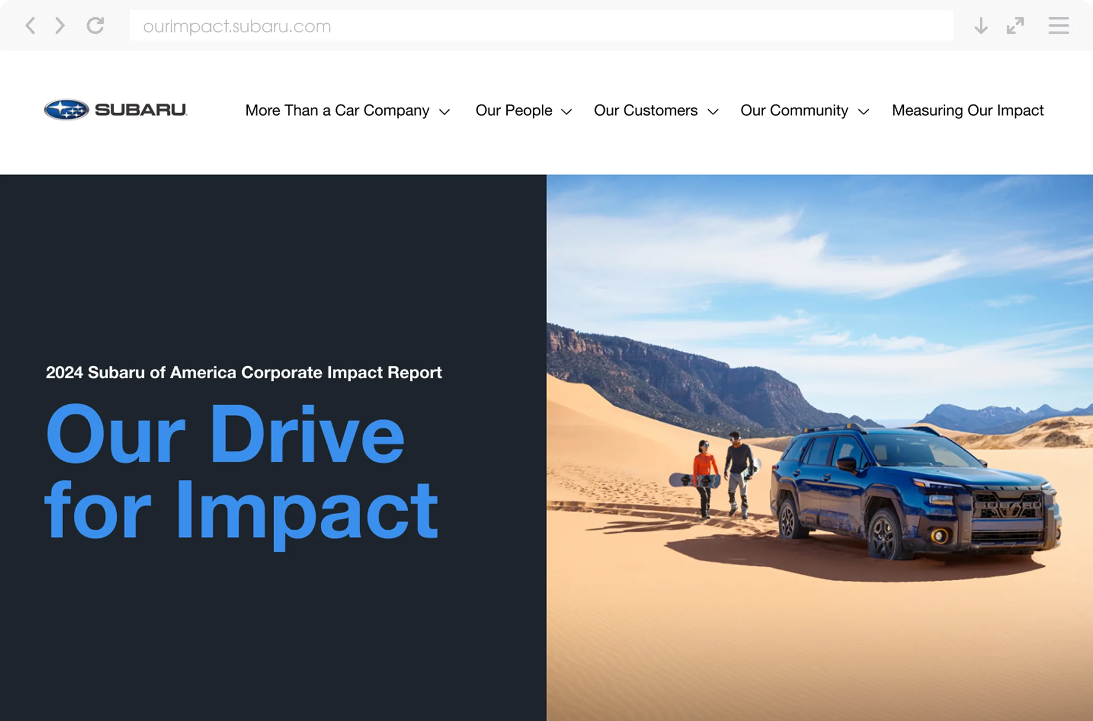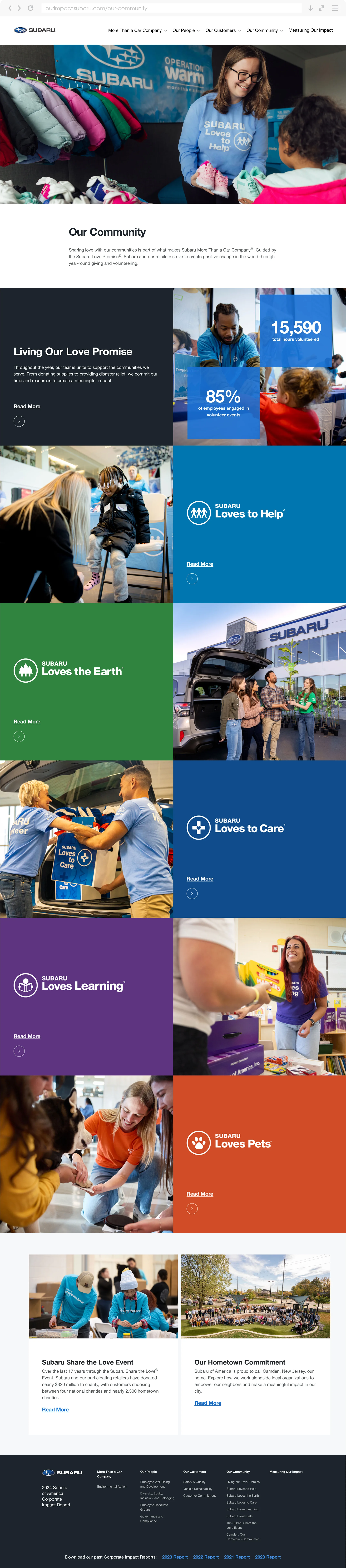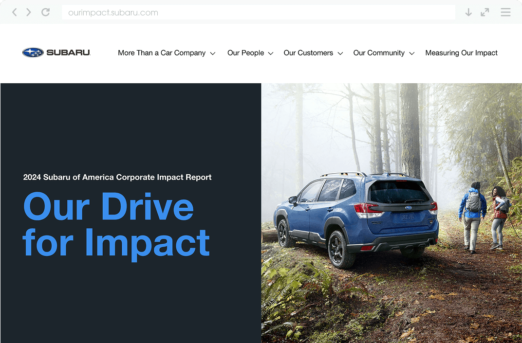 Subaru wanted its corporate impact report to feel more than just informational — it needed an experience that reflected its commitment to people, the planet, and the community. The goal was to create a dynamic, immersive space that mirrored the look and feel of Subaru.com, while bringing stories to life in a way that inspired and connected. The report also had to clearly communicate Subaru’s More Than a Car Company® positioning and present robust impact data in a format that was accessible, engaging, and meaningful.